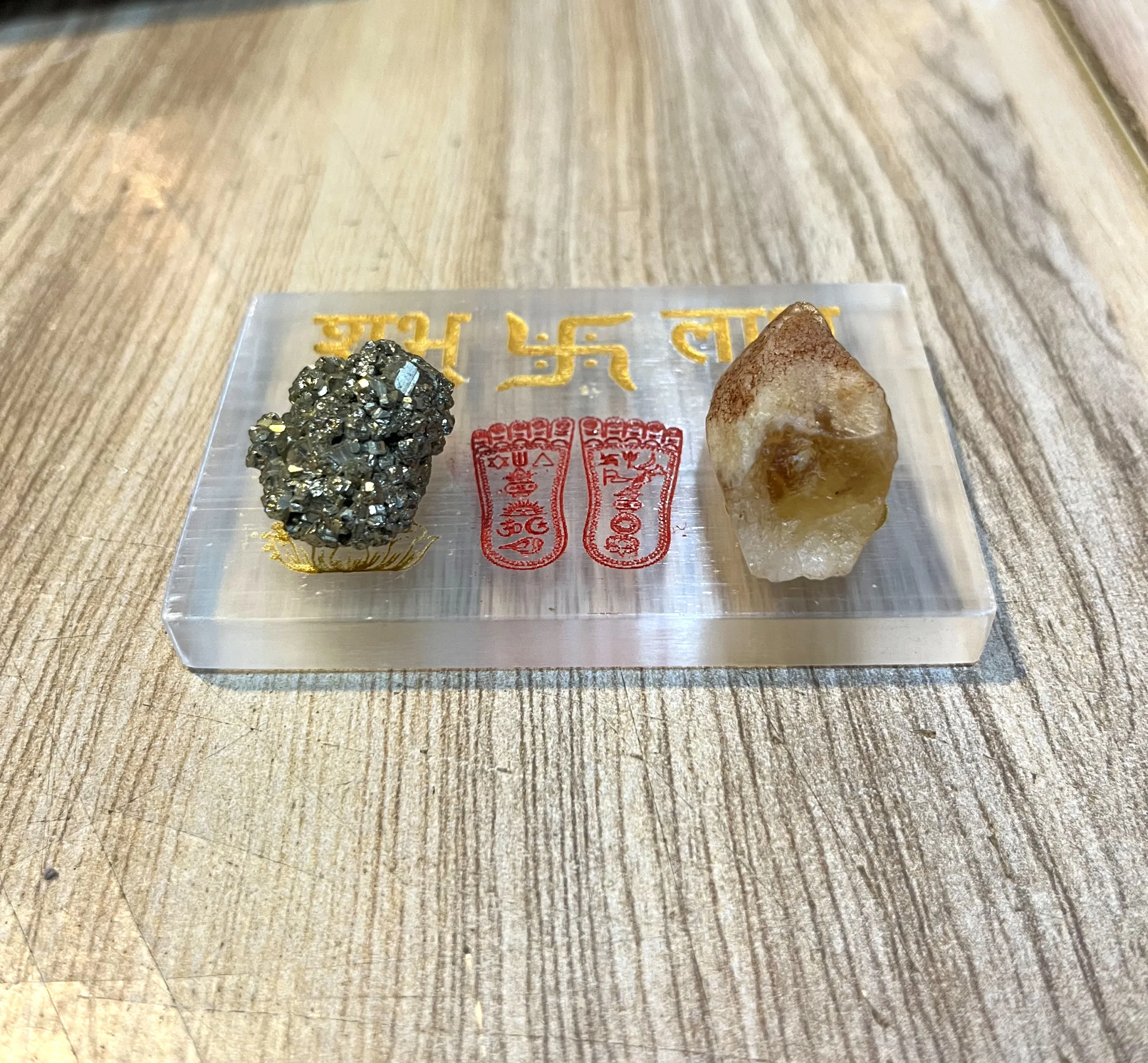 raw pyrite and raw citrine on selenite plate.
